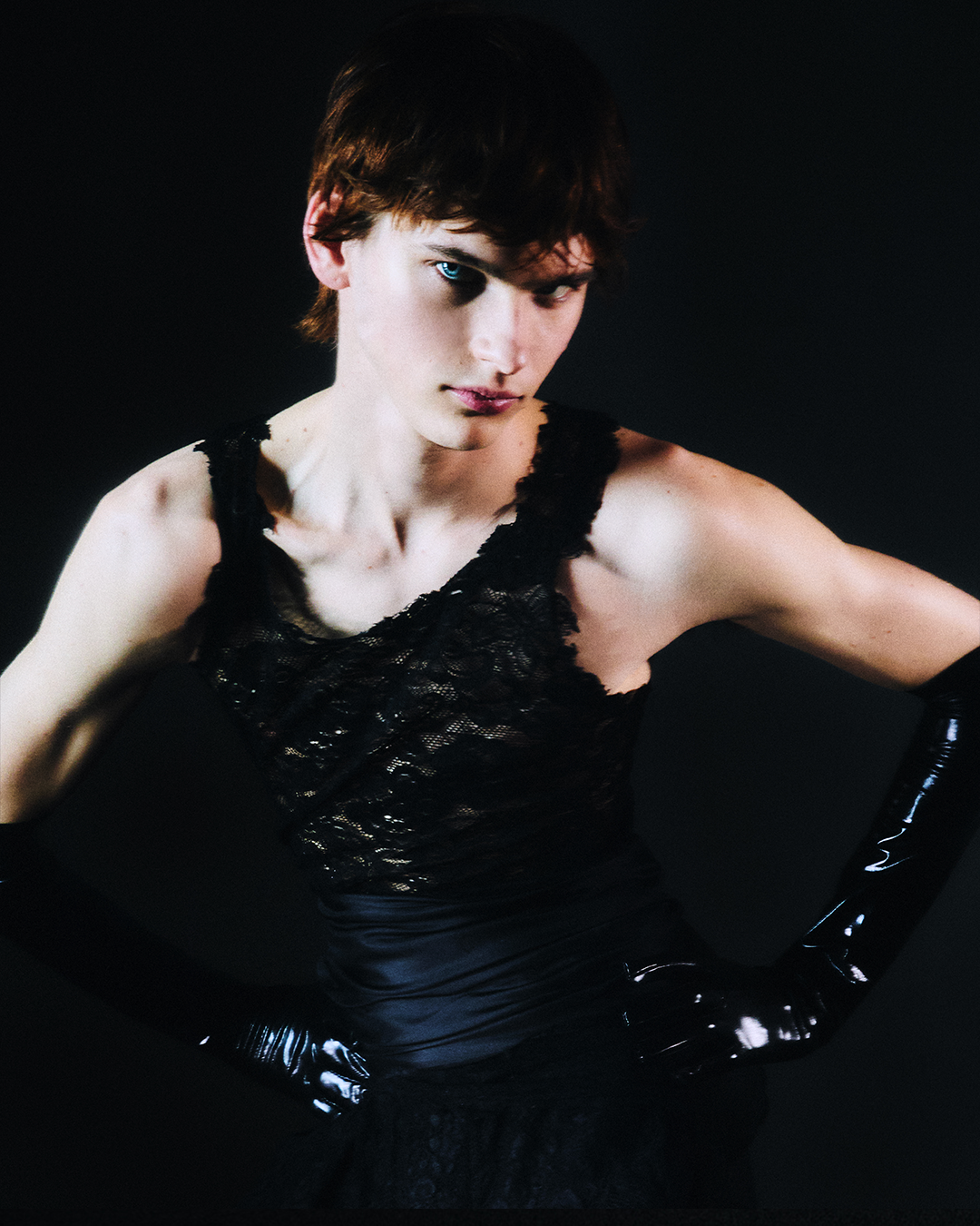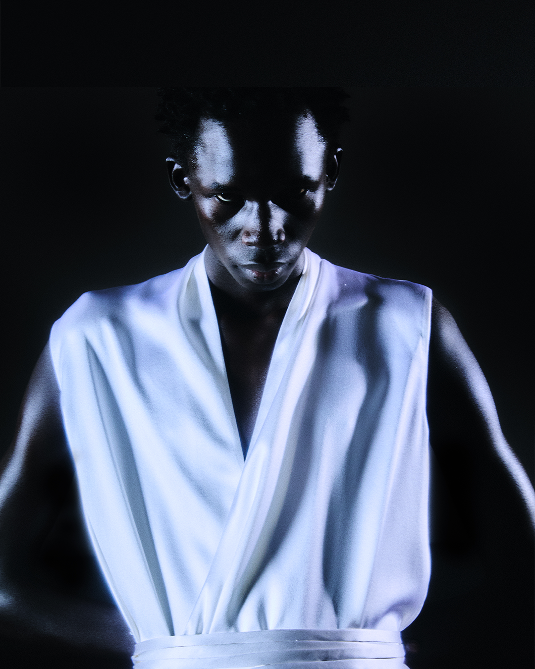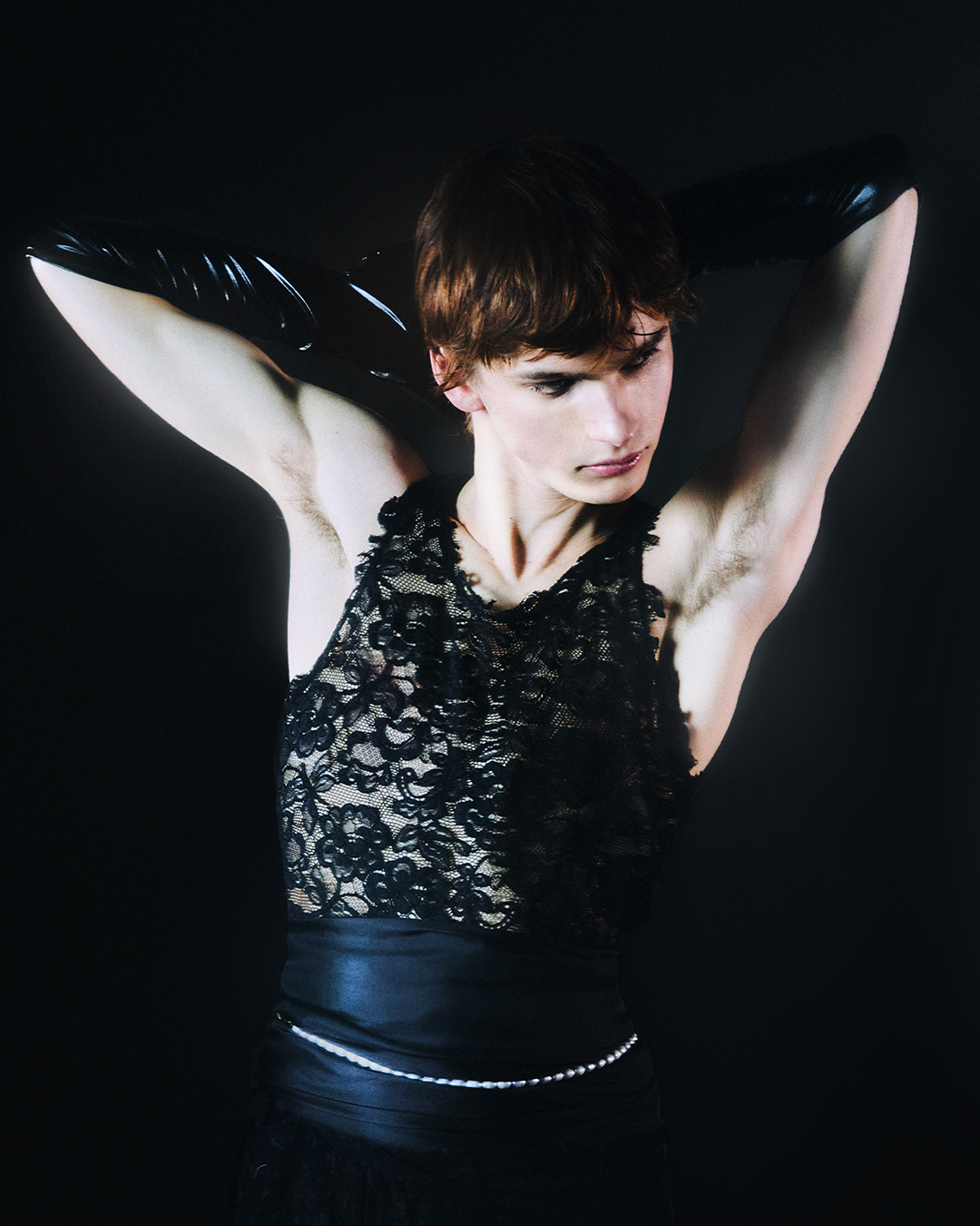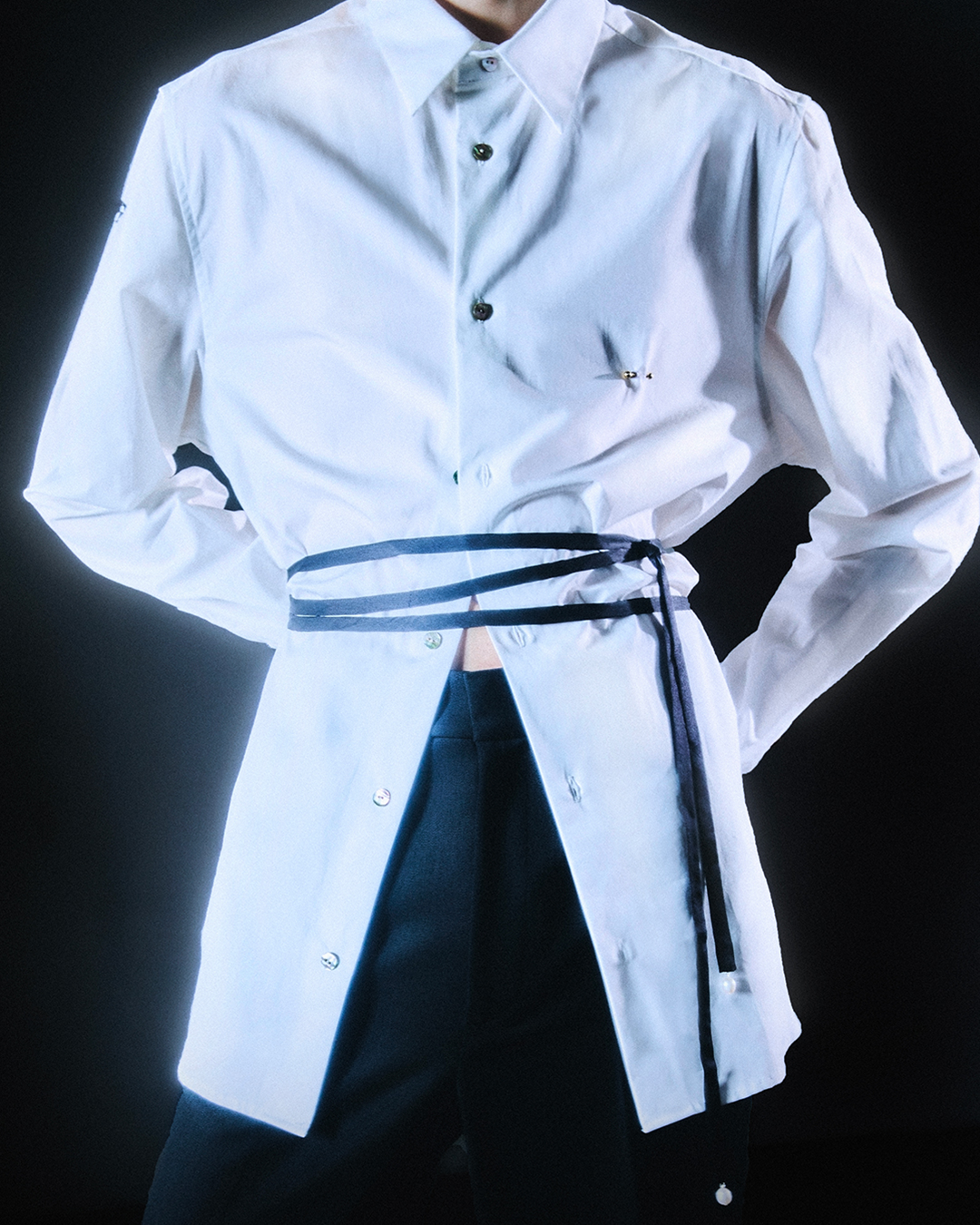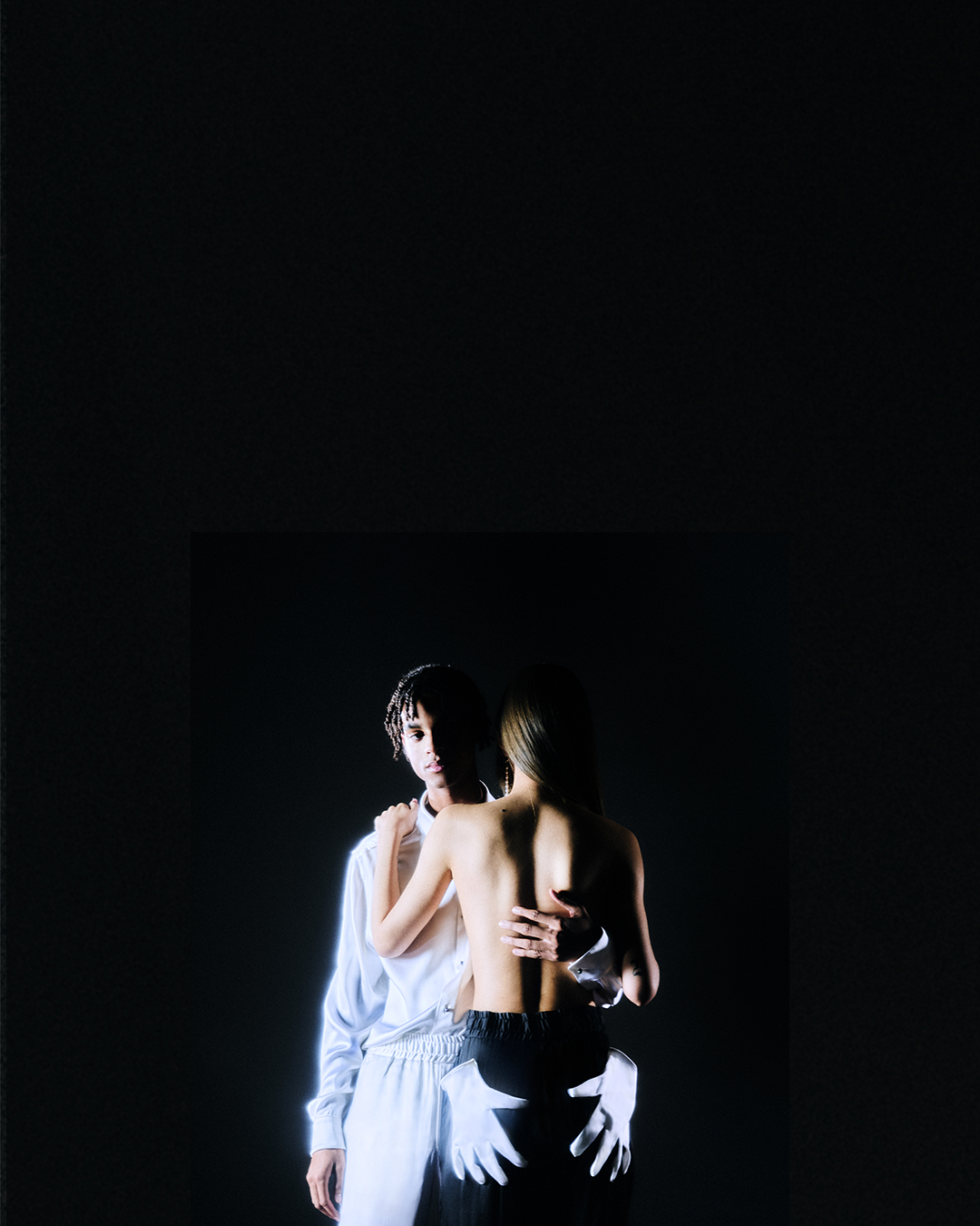 Paradoxically, oppression and pain can also be associated to pleasure and sexual freedom, or feel comforting to some. Clothes are questioning even more the complexity of sexuality and beauty. Belted waists in soft silk are drawing from the flattering New Look proportions and the tailoring codes of a traditional cummerbund. Ignited by the draping of the well-known liberty allegory painted by Delacroix, strips of fabric and gloves hug the body in a sugarcoated eroticism. They remind of the romanticism of vines or a cowboy’s lasso, and bondage photography like the mysterious never-claimed serie known as “Mr. Steinberg’s model”, depicting a woman in satin dress, also echoing the wrapping work of Christo and Jeanne-Claude.