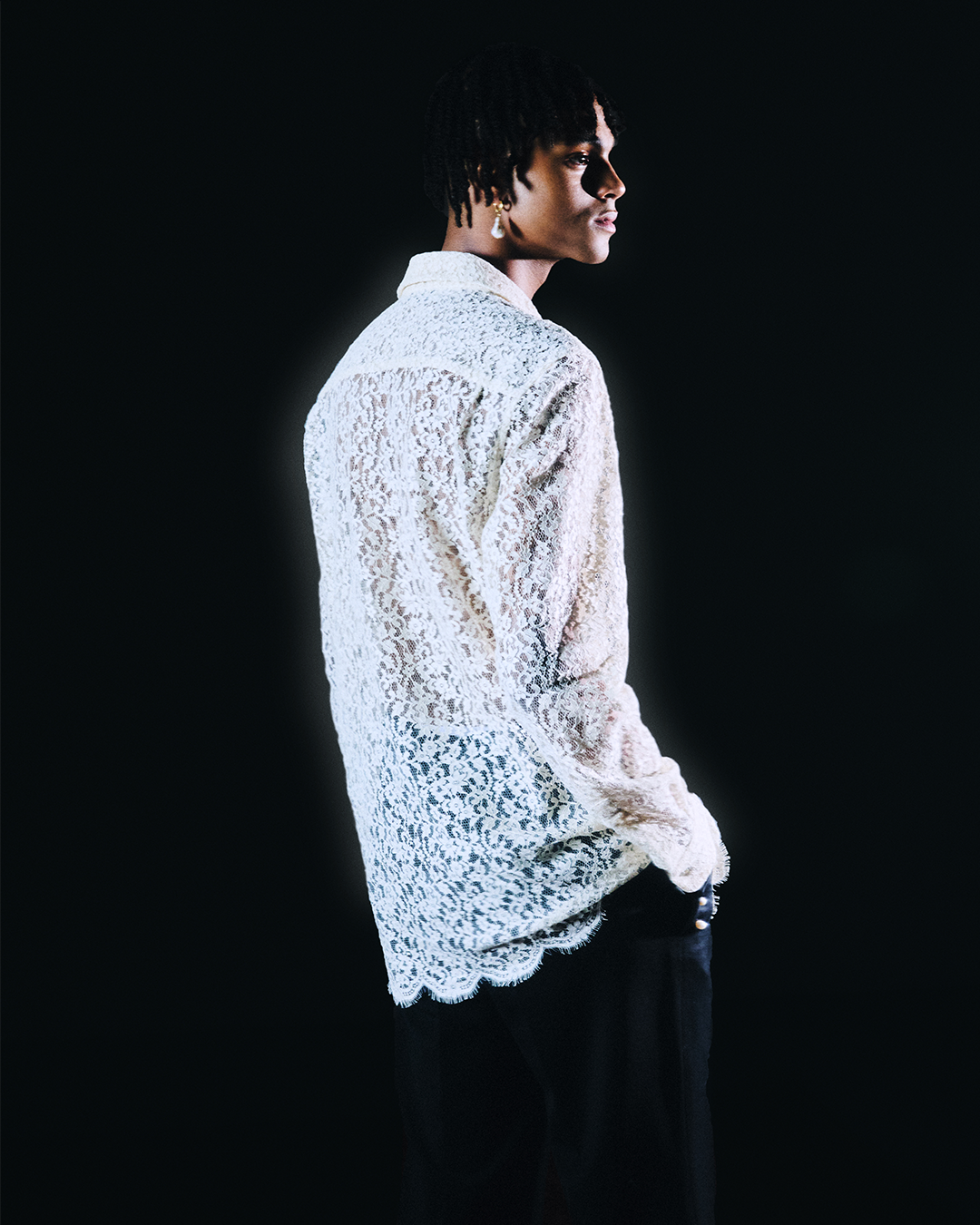 Old and new. Rawness and glamour. Nature and craftsmanship. Masculine and feminine. Duality brings balance, contrast, texture and depth to fashion. Gendered clothing is deconstructed and rebuilt into a fluid and elegant silhouette that provides the wearer with confidence, combining traditional tailoring codes with skirts, white pearls, upcycled couture lace and silk. The luxurious materials, gloves and monochromatic palette convey a feeling of opulence evoking the couture heritage in Paris and its liberating nightlife. The see-through lace gives a tempting glimpse of the body, a sultry comfort for the hot days. Every piece is versatile and can be easily worn by men and women in countless ways, to make it feel personal and true to one’s individual style, challenging the idea that a look is a finished design that shouldn’t be altered.