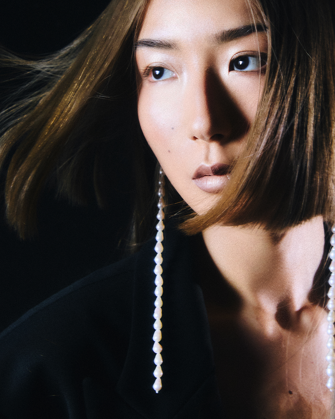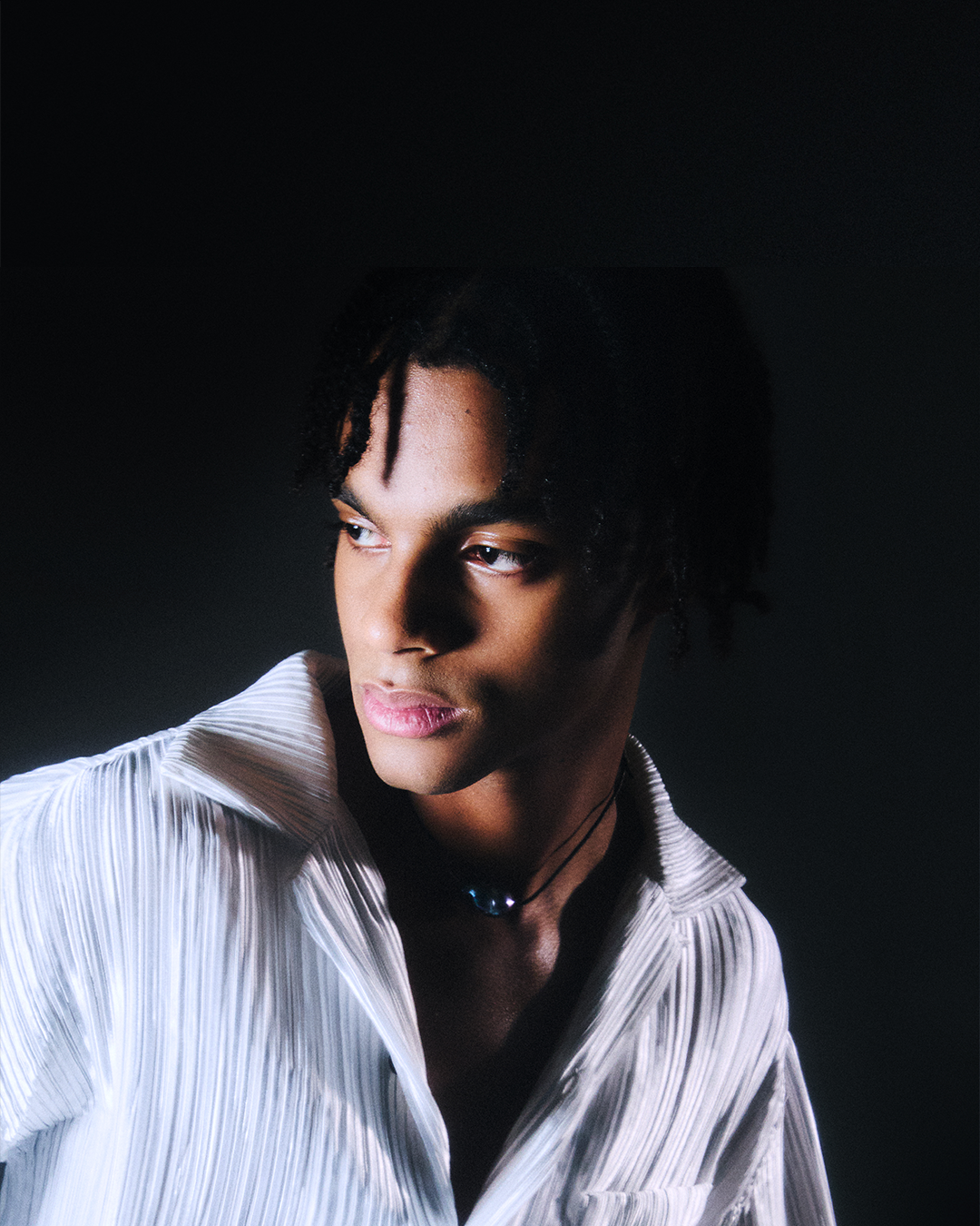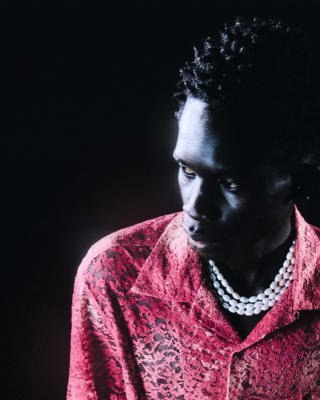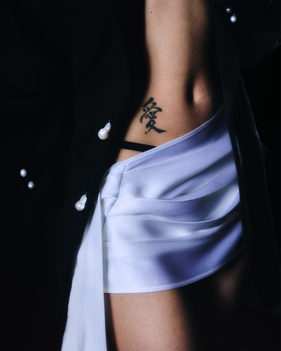 Embarking on this creative journey is my personal way to feel free, to let my imagination run wild on this ocean of possibilities. A collection is thought as a dreamed island you can’t see yet behind the horizon, mapping an archipelago of memories, emotions and references. The sensations of freedom we have when our feet are in the warm sand, the wind blowing in the hair, the sun reflecting on wet skins, is symbolized by pearls throughout the collection, as a souvenir you would bring home from vacation. The raw natural beauty of baroque pearls is tied around the neck like islanders. They blur the lines between clothes and jewelry, embellishing tailored jackets in grain de poudre wool, dry like grains of sand, and sensual silk shirts reminiscent of the undulating shiny surface of the water. Contrasting gloves are embroidered like hands casting a black shadow at the zenith, or leaving a white tan line. As if it had been exposed to the sun and salt, a bleached effect on pink lace recalls the colors of a sunset sky.